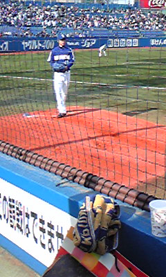 神宮球場着は1時間前。どうしよっかな~と思いつつ、グラウンドを見れば・・・!なんと!中日の選手が練習しているではありませんか!しかも、つばくろうもいるっ!!
