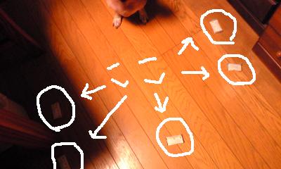 モチ子の目の前に5つの紙を散らばせます。もちろん「待て!」と必死に声をかけます。「待てだよ!」と言い聞かせます。