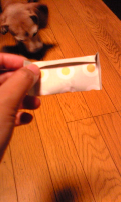「はい、いいよ!」と言ったものの、なかなか選ばず、私の持ってる他のエサに夢中なモチ。これは作戦失敗か!?と思ったら、バクッと一つくわえました。「協力ありがとう」と、持っていたエサを与え、くわえた紙を返してもらいました。